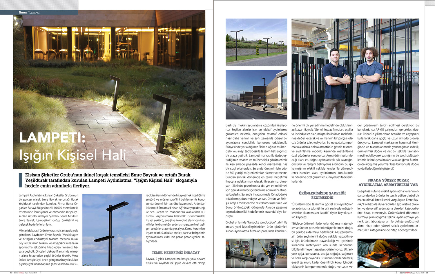 Elsisan Şirketler Grubu’nun ikinci kuşak temsilcisi Emre Bayrak ve ortağı Burak Yeşildurak tarafından kurulan Lampeti Aydınlatma, ‘’Işığın Kişisel Hali’’ sloganıyla hedefe emin adımlarla ilerliyor.