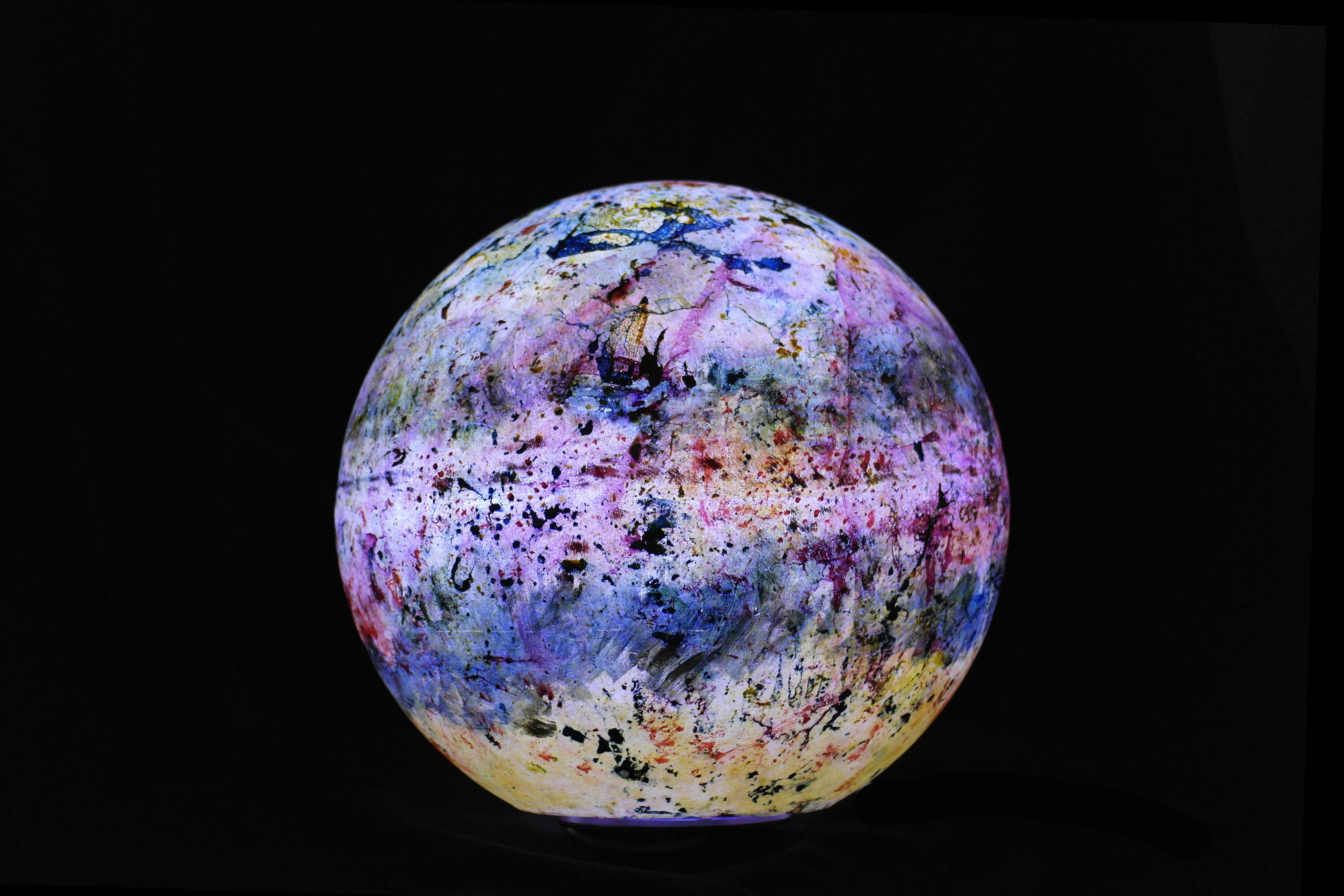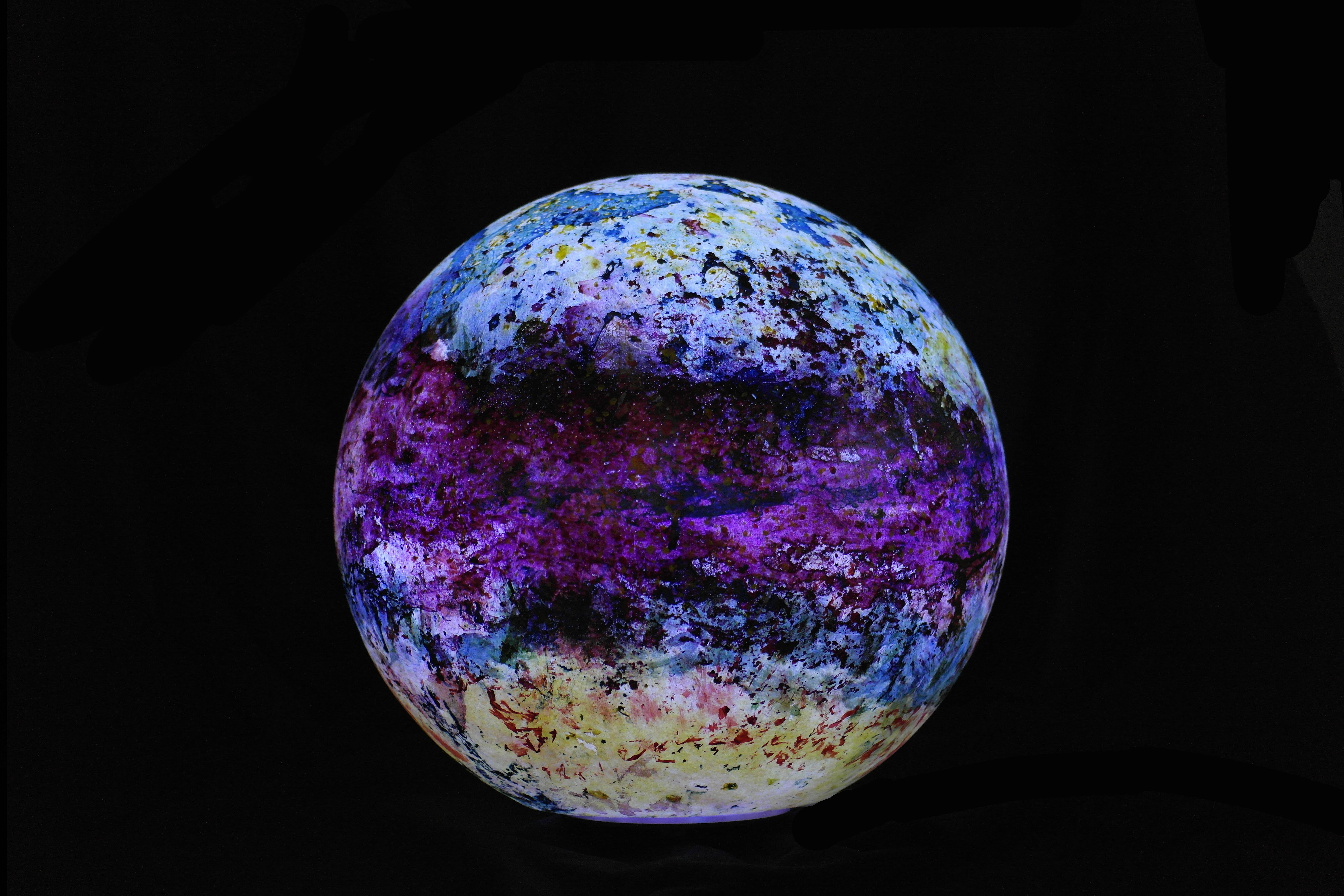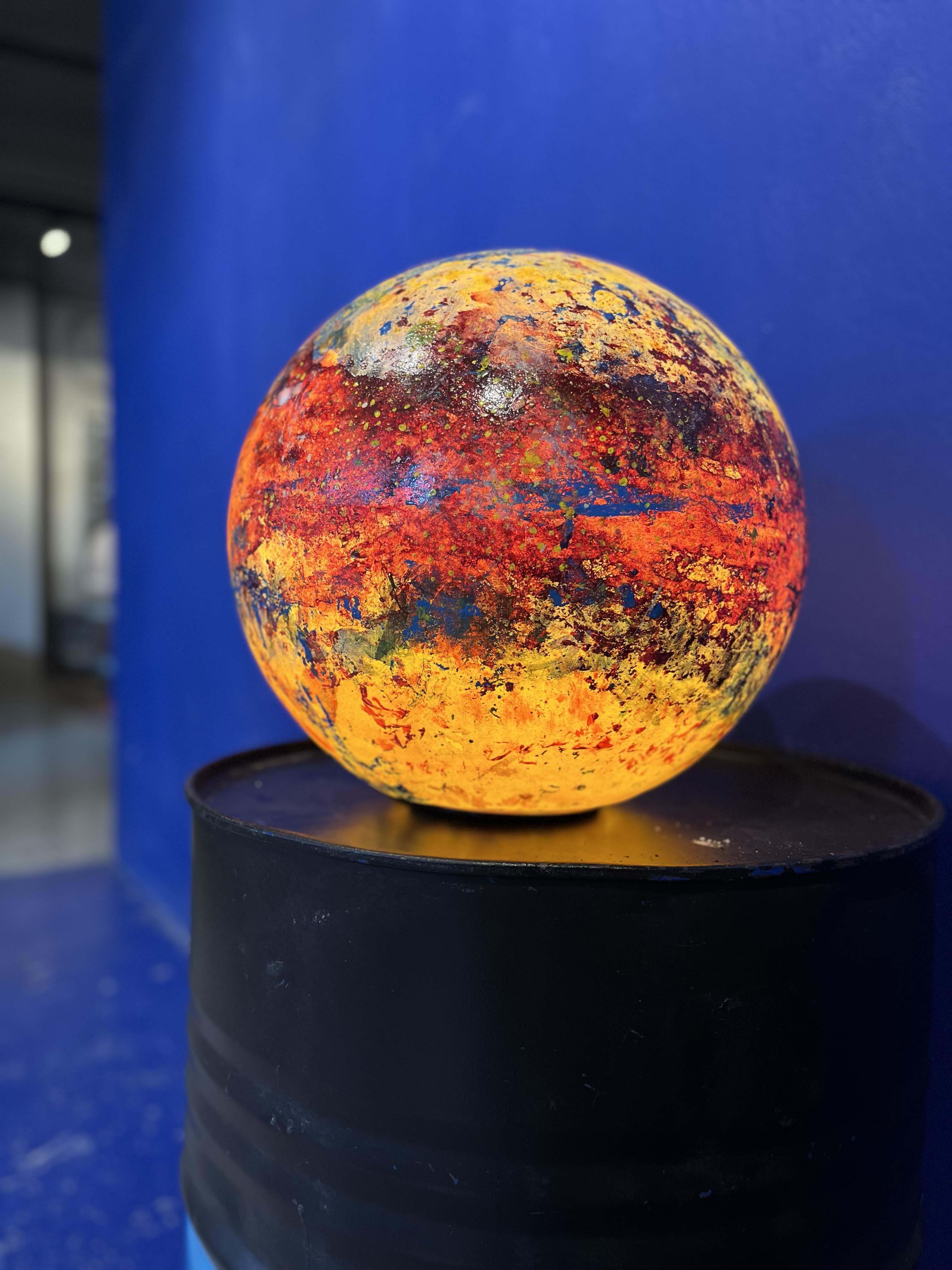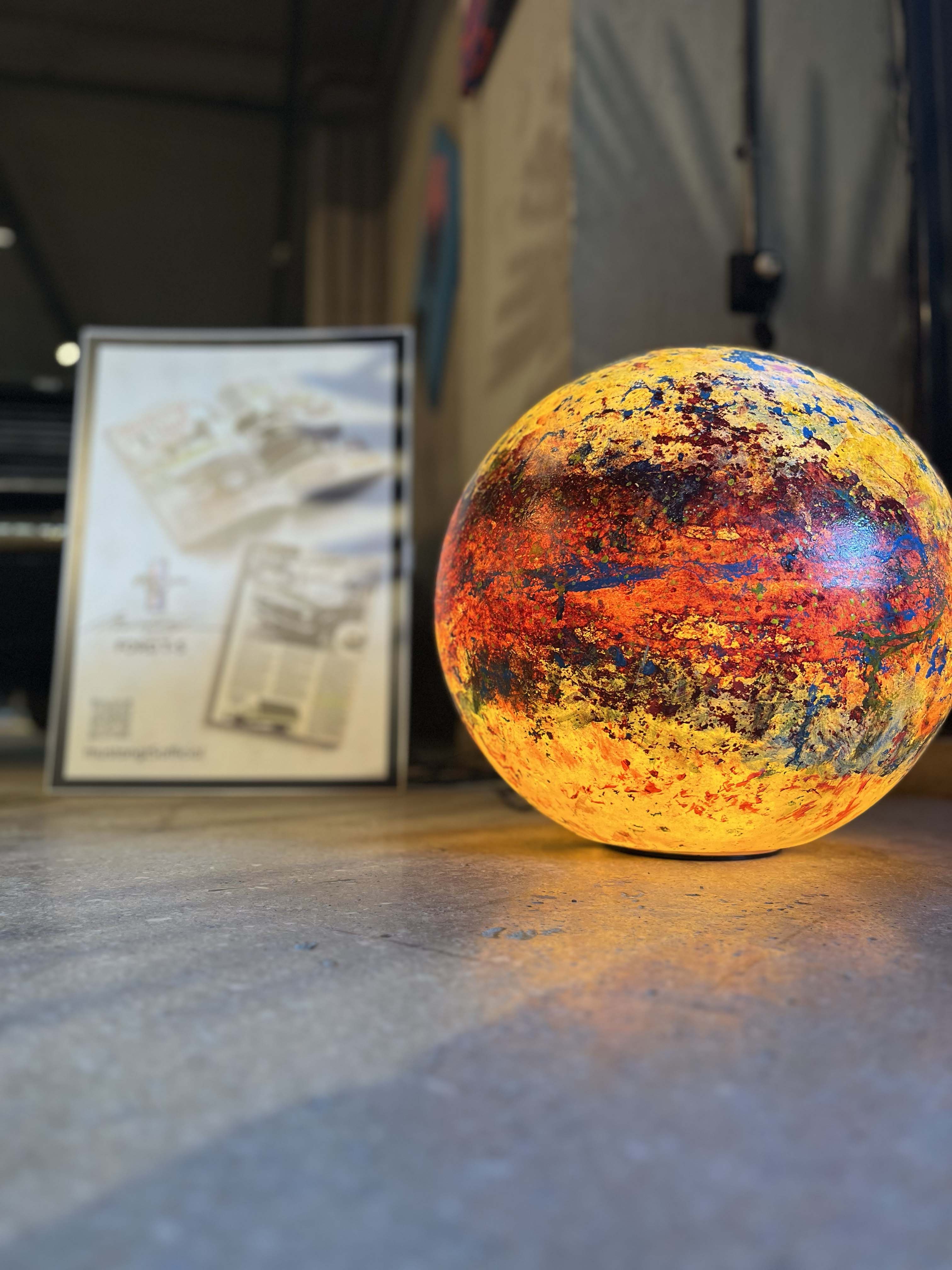 Poliüretan glop üzerine el boyaması olan “Genesis” isimli yeni çalışmamızda, koyu mavi ve sarı tonlarının oluşturduğu derin kontrastlar, aydınlatma küresine güçlü bir boyut kazandırıyor. Yeşilimsi tonlar ise bu etkiyi dengeleyerek kompozisyona doğal bir akış katıyor.