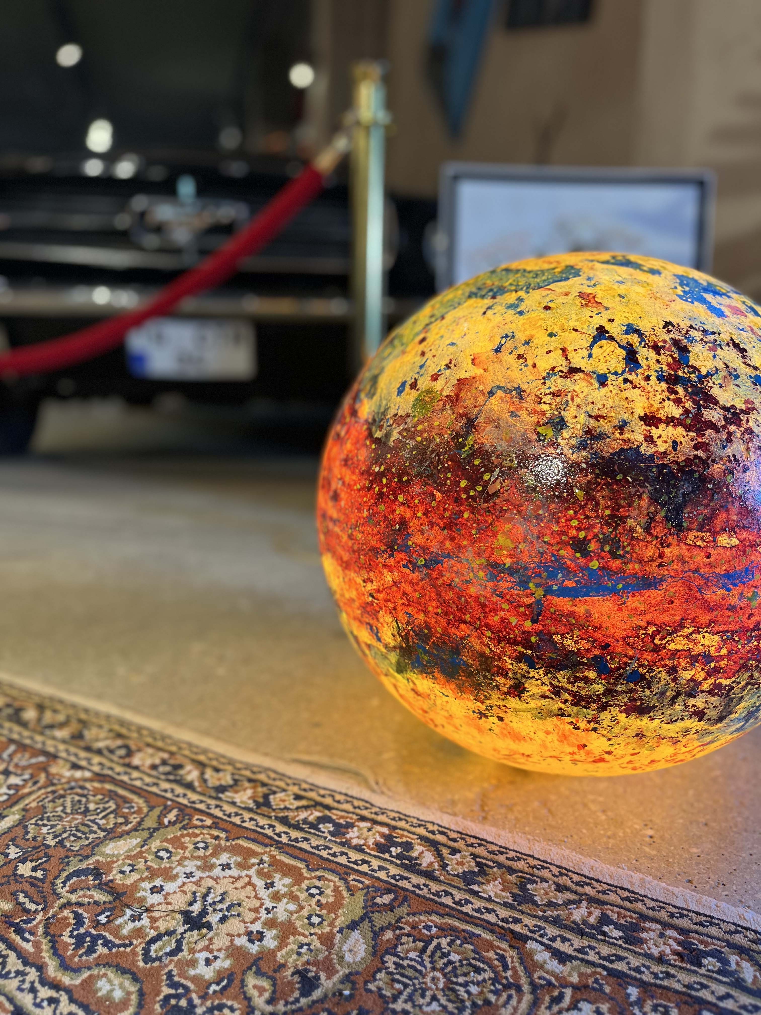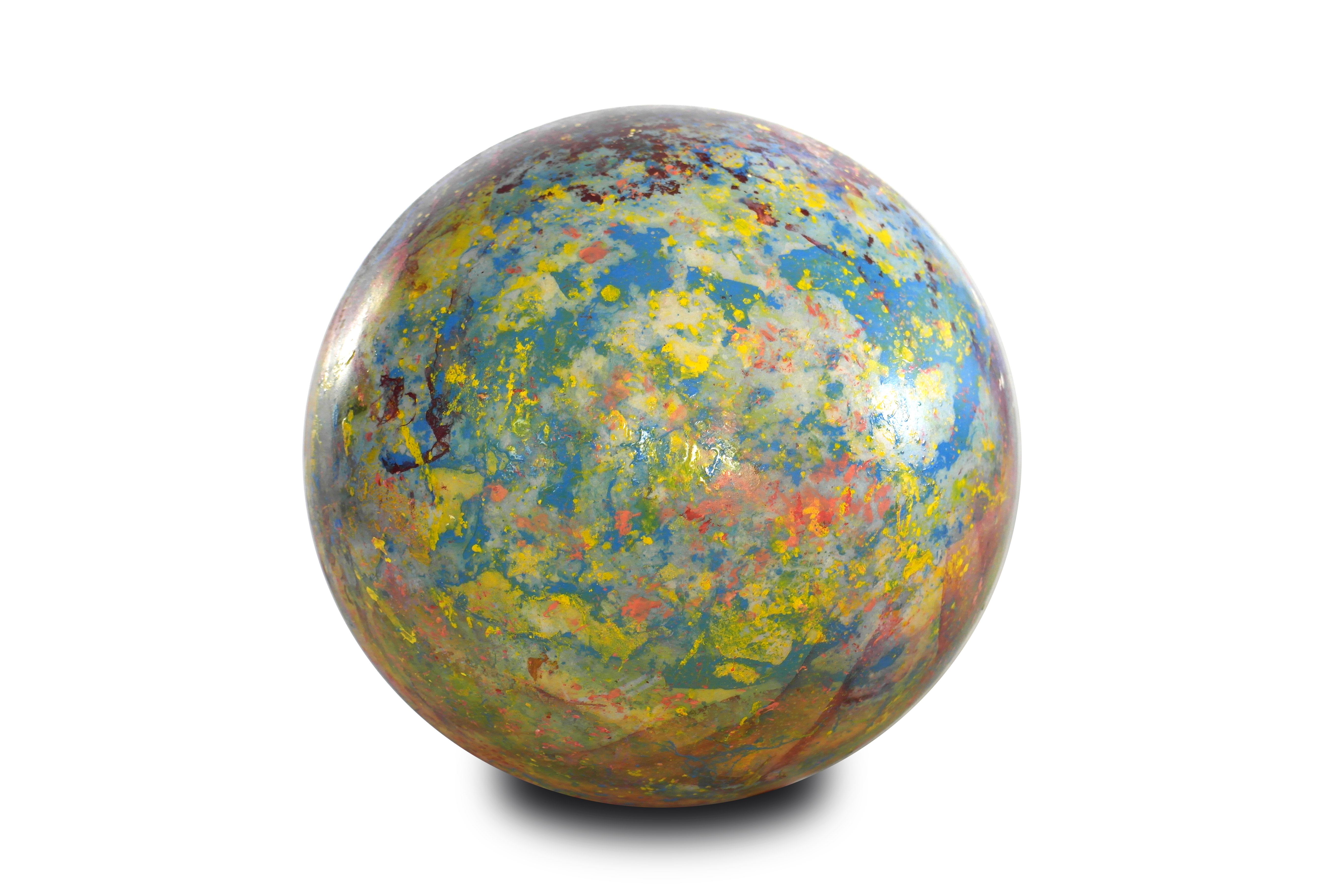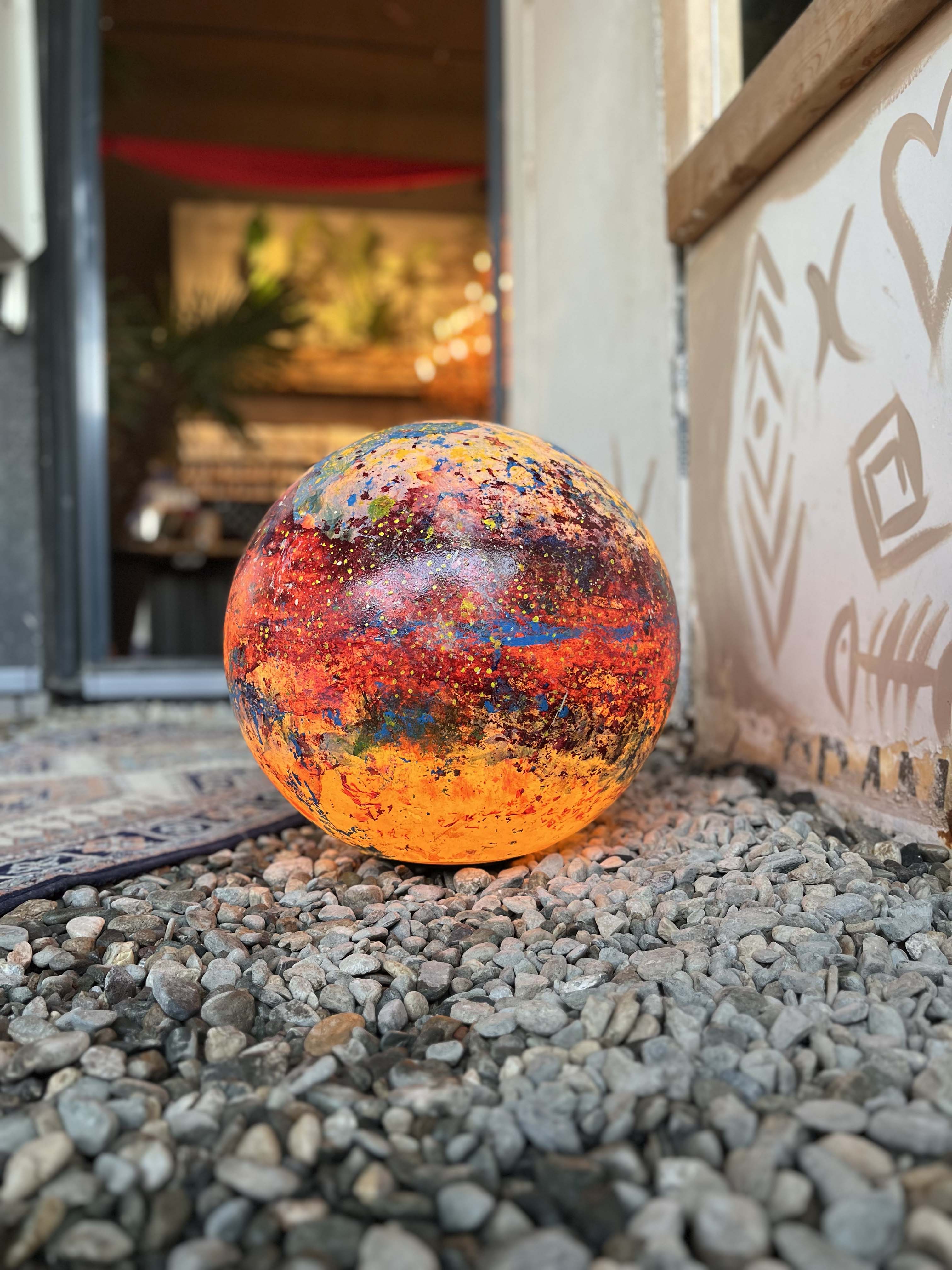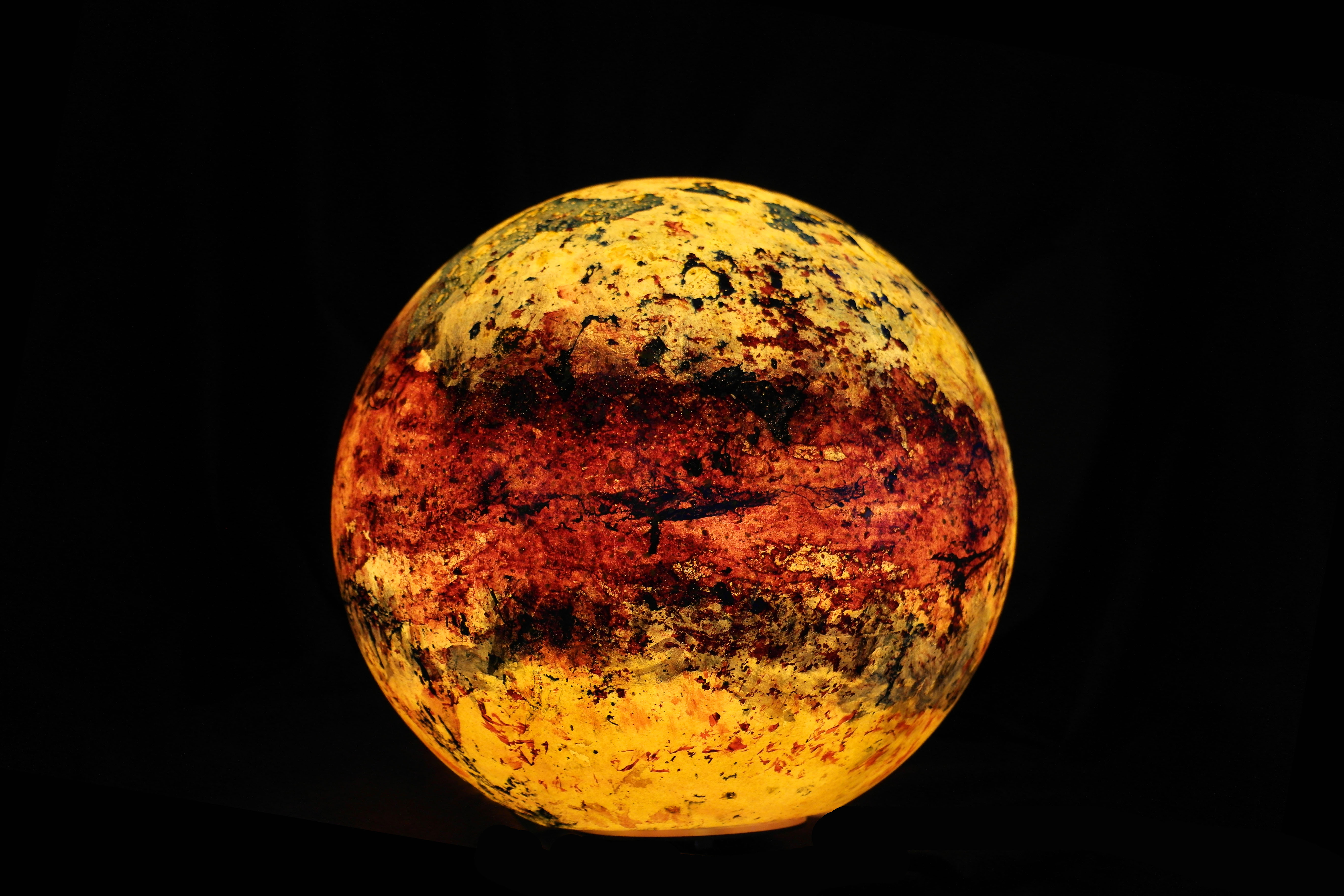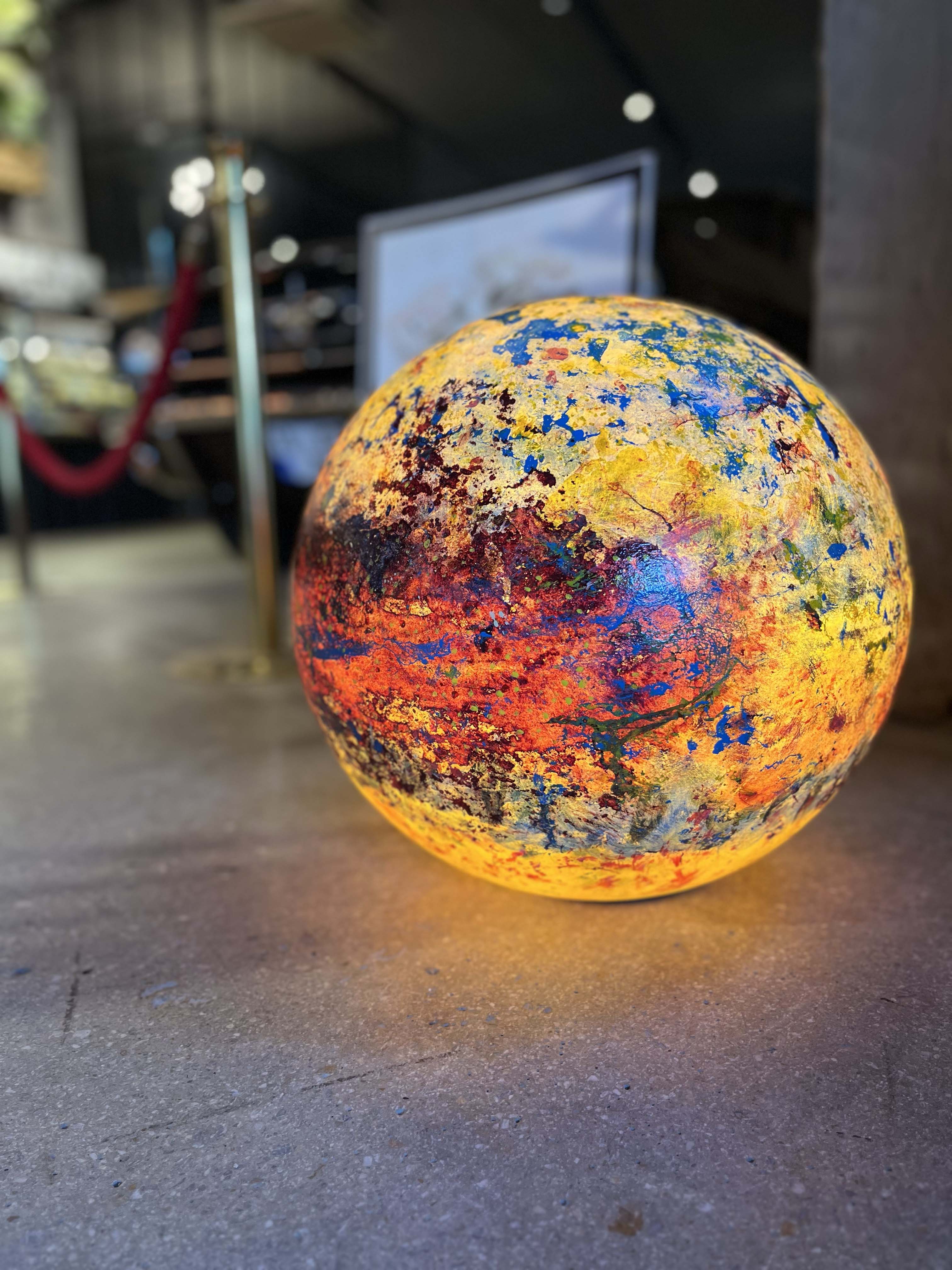 Poliüretan glop üzerine el boyaması olan “Genesis” isimli yeni çalışmamızda, koyu mavi ve sarı tonlarının oluşturduğu derin kontrastlar, aydınlatma küresine güçlü bir boyut kazandırıyor. Yeşilimsi tonlar ise bu etkiyi dengeleyerek kompozisyona doğal bir akış katıyor.